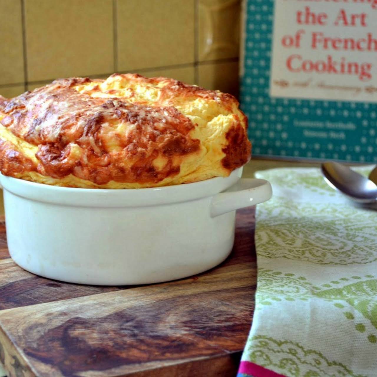 Julia Childs Cheese Souffle when Butter, Grated Parmesan Cheese, Flour, Milk, Egg Yolks, Egg Whites, Grated Gruyere Cheese, Cayenne, Salt, Pepper, Nutmeg, Cream Of Tartar