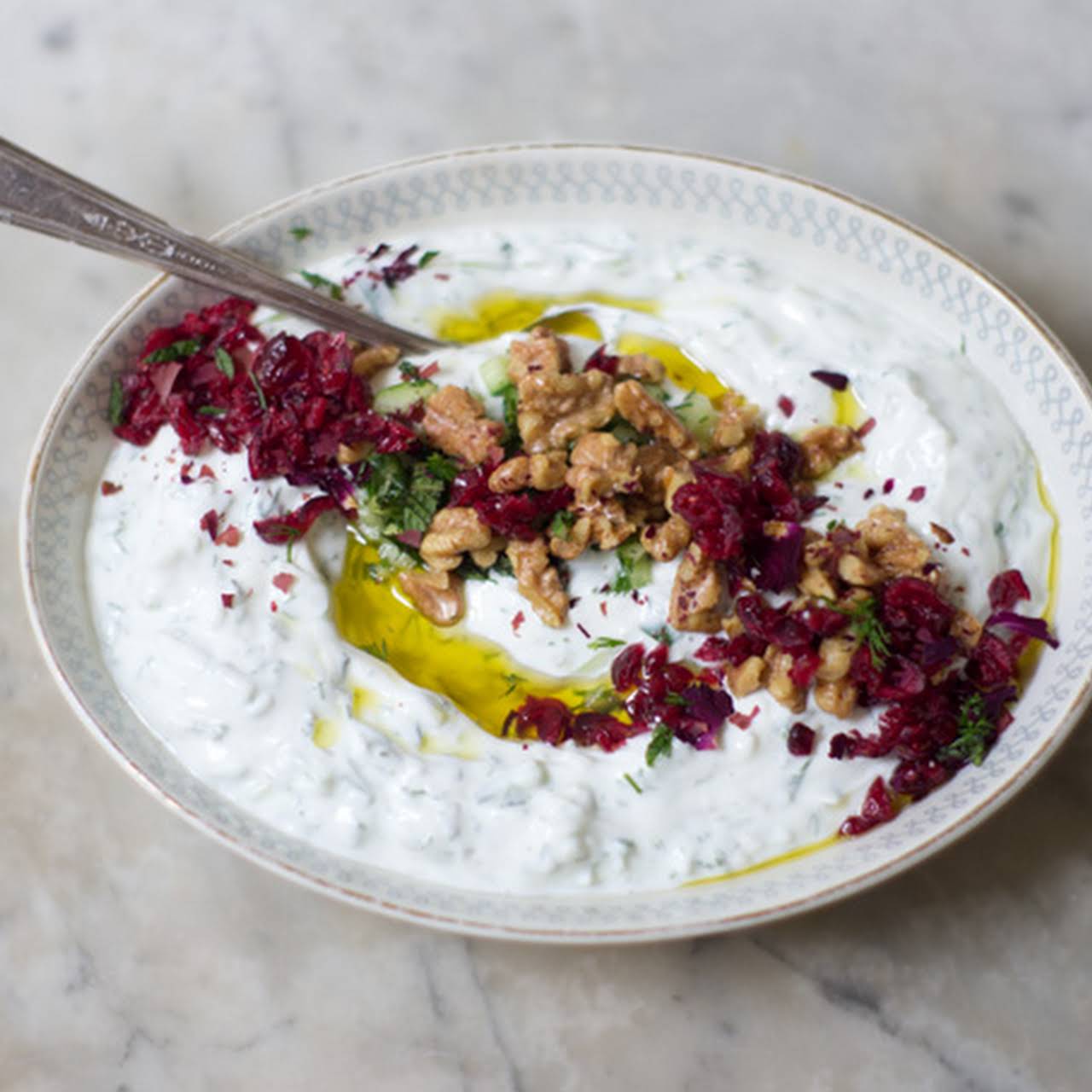Mast-o-khiar Yogurt Dip subsequent to Garlic Cloves, Fine Sea Salt, Greek Yogurt, open Dill, lighthearted Mint, Cucumber, Extra-virgin Olive Oil, Walnuts, Rose Petals, Dried Cranberries